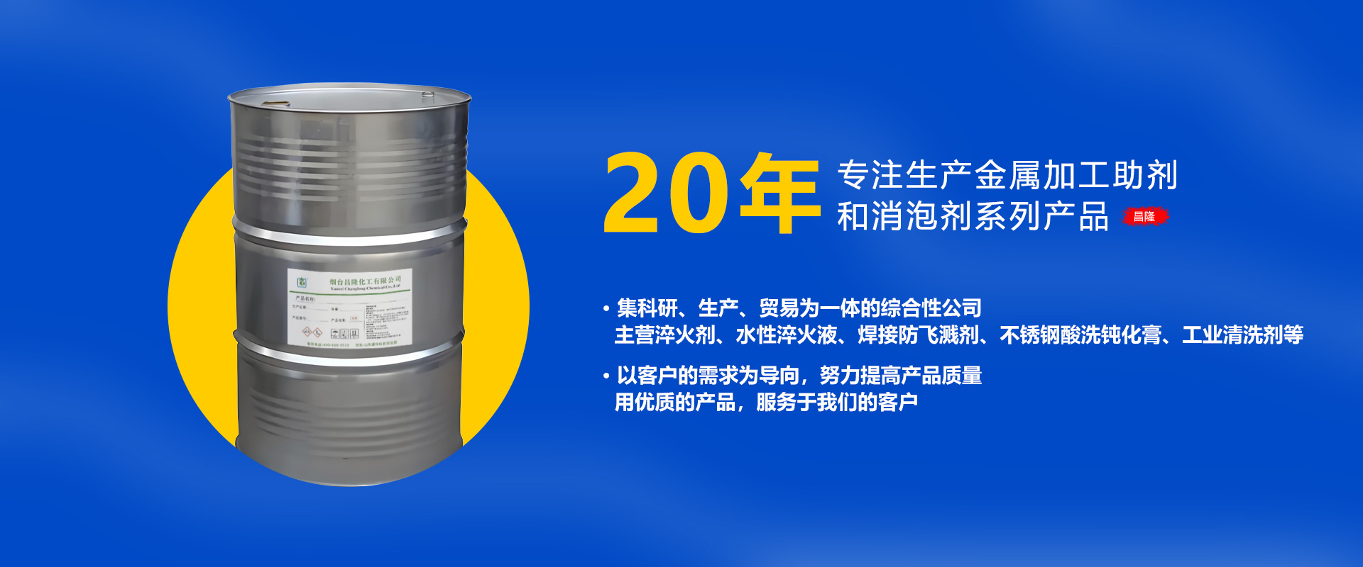 煙臺昌隆化工有限公司座落在美麗的海濱城市煙臺,創建于2005年,是一家集科研、生產、貿易為一體的綜合性公司,主營淬火劑、水性淬火液、焊接防飛濺劑、焊接防濺劑、不銹鋼酸洗鈍化膏、發黑劑、工業清洗劑等,在全社會環保意識普遍增強的大環境下,公司審時度勢,乘勢而上,大規模生產多種金屬加工助劑和消泡劑系列產品。